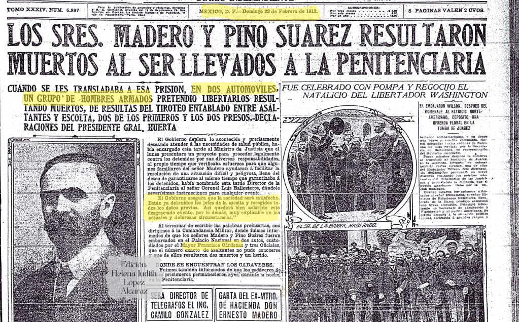 Cárdenas reiteró la orden de manera perentoria y soez y lo forzó a bajar. Al obedecer el presidente, el rural palmeño blandió su pistola y le descargó dos tiros en la cabeza. A continuación, con la misma brutalidad, Pino Suárez cayó bajo las balas de Pimienta.