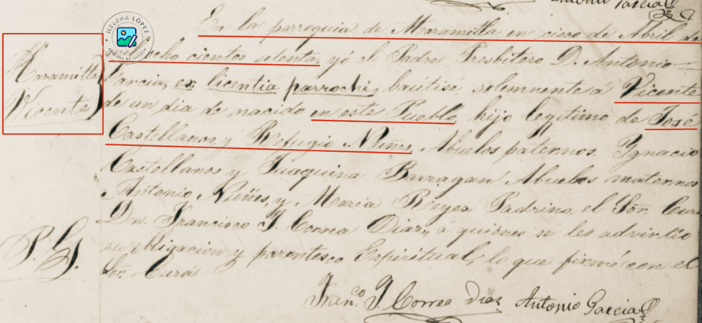 Dentro: En la parroquia de Mazamitla en cinco de Abril de / mil ocho cientos setenta, yo el Padre Presbitero D. Antonio / Garcia ex licentia parrochi [1] bautisé solemnemente á Vicente / de un dia de nacido en este Pueblo, hijo legítimo de José / Castellanos y Refugio Nuñes, Abuelos paternos Ygnacio / Castellanos y Juaquina [2] Barragan Abuelos maternos / Antonio Núñes, y Maria Reyes, Padrinos el Sor. [3] Cura / Dn. Francisco J. Correa Diaz, á quienes se les advirtio / su obligacion y parentesto Espiritual, lo que firmó con el Sor. Cura.