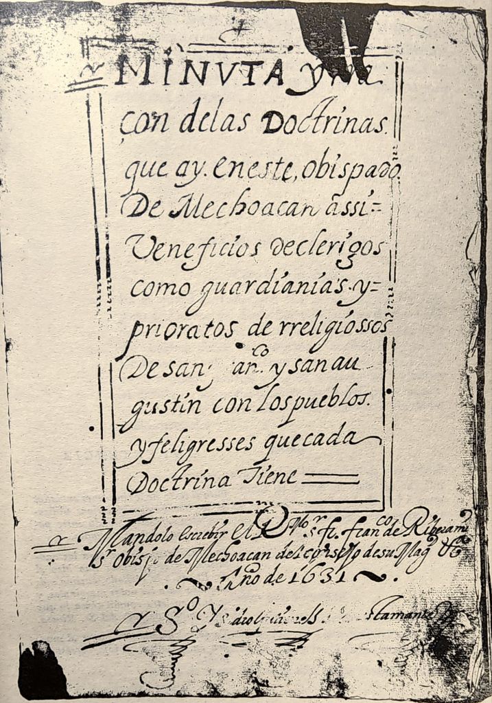 La descripción antigua de los curatos y doctrinas, un libro que se escribió en los primeros años del siglo XVII, que tiene la inscripción «libro de la minuta de las doctrinas que ay en este Obispado de Mechoacan, Assi veneficios de clérigos como guardianías y prioratos» es la más amplia descripción de los curatos diocesanos, agustinos y franciscanos del antiguo Obispado de Michoacán.
