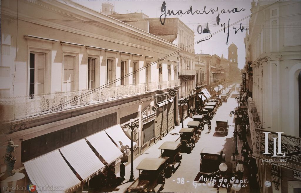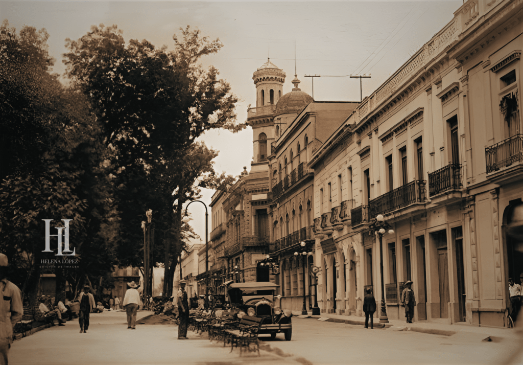 Fotografía tomada desde la esquina de la Av. Corona con la calle Prisciliano Sánchez. A la izquierda, el jardín de San Francisco, escenario de la matanza de los obreros católicos el 26 de marzo de 1922. Imagen de Guadalajara antigua; edición hecha por la autora.