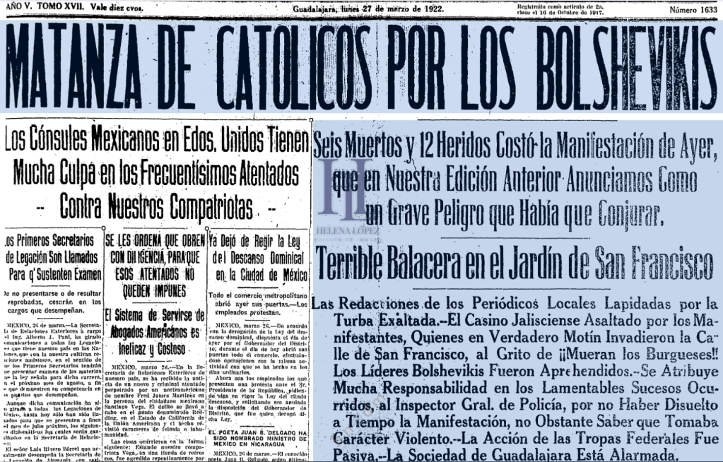 Ya desde 1921, la antigua Ciudad de las Rosas había sido testigo del arribo de militantes comunistas. Basta recordar que el 1° de mayo de ese año, a la vista de la sociedad tapatía, habían izado la bandera rojinegra en nada más y nada menos que en la Catedral. El estudiante de leyes Miguel Gómez Loza –cuya muerte tuvo lugar un 21 de marzo, pero de 1928, justo el mismo día que fueron ultimados los veintisiete cristeros en el atrio de la Parroquia de Santo Santiago en Sahuayo, Michoacán–, sin medir el peligro, subió, la quitó y la hizo jirones, aunque eso le granjeó una golpiza de los rojos, que lo dejaron ensangrentado y medio muerto.