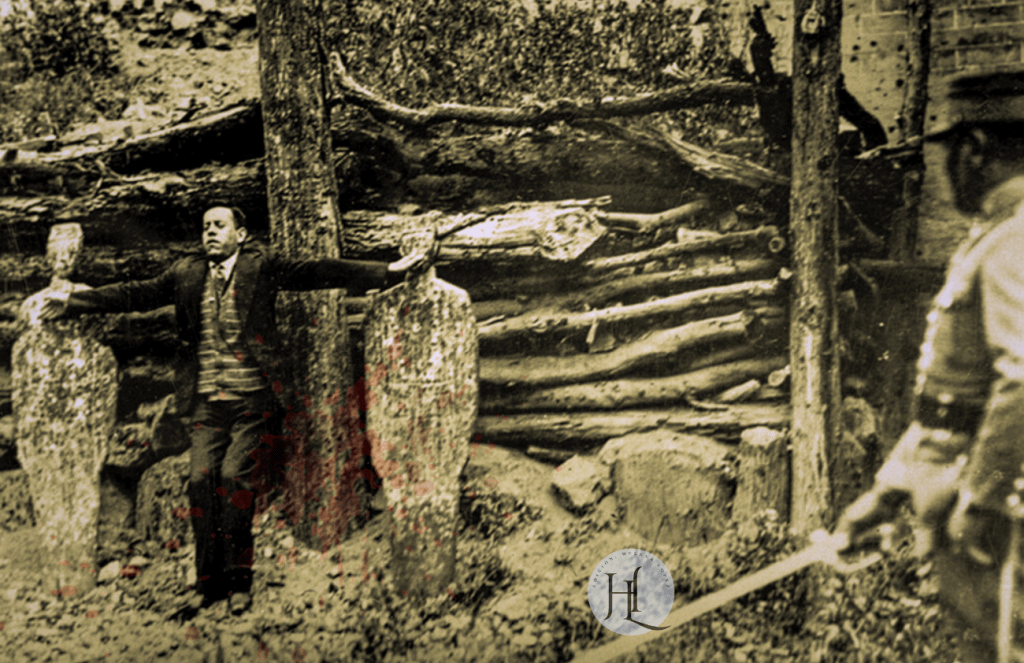 Detalle de una de las instantáneas tomadas durante el fusilamiento del Padre Miguel Agustín Pro, el 23 de noviembre de 1927, en el patio de la Inspección de Policía de la Ciudad de México. Imagen del Archivo General de la Nación (AGN).