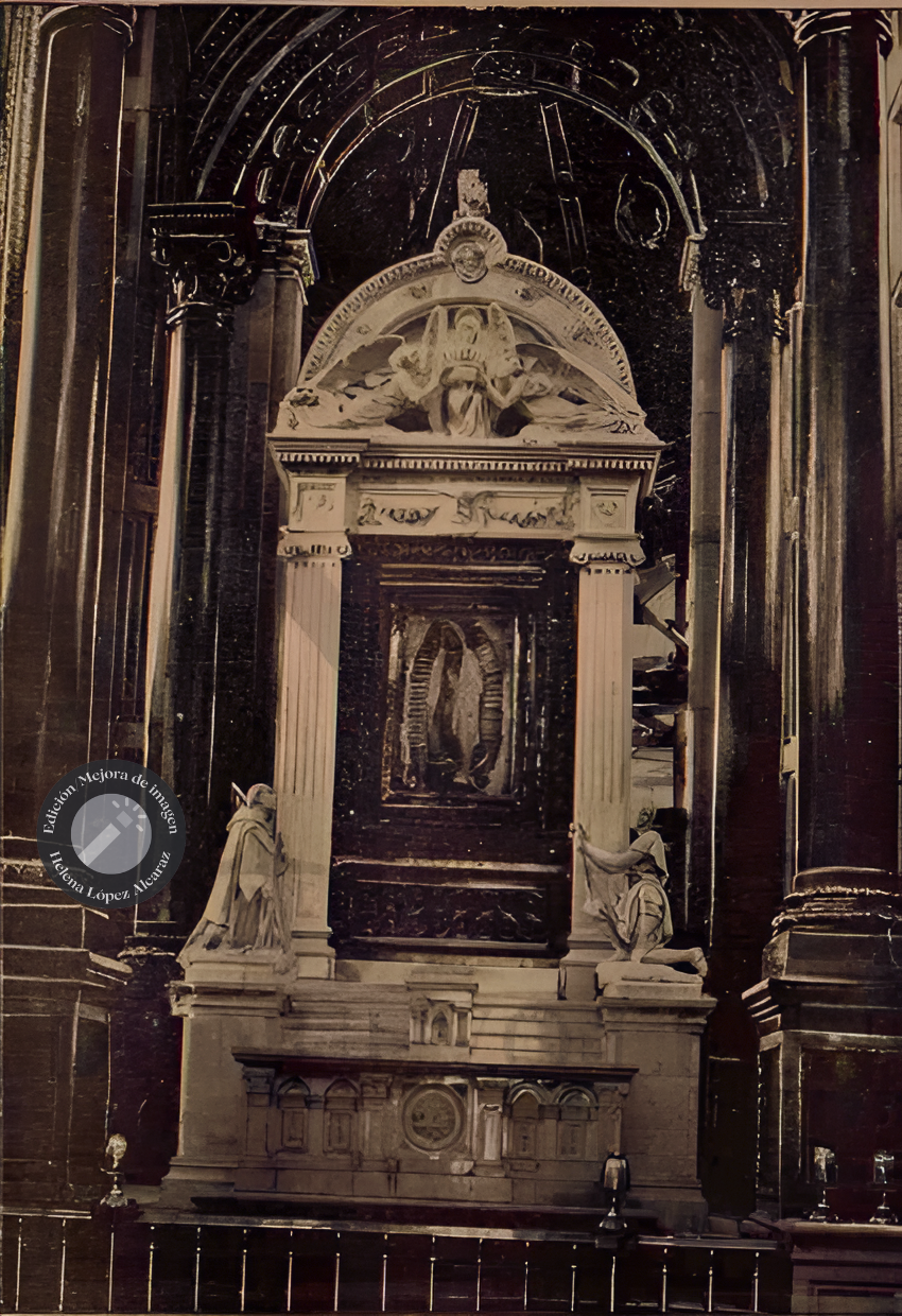 Altar mayor y trono de la Santísima Virgen de Guadalupe, dispuestos para la Coronación Pontificia, el día en que el primero fue consagrado, 1 de octubre de 1895. Imagen tomada del Álbum de la coronación de la Sma. Virgen de Guadalupe y mejorada y editada por la autora.